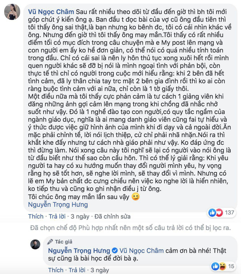 Có lẽ không ai biết được mối quan hệ bạn bè thân thiết giữa Trọng Hưng và Ngọc Châm nếu dân mạng không tình cờ "đào" lại được bình luận dài cả cây số trong một bài đăng của Trọng Hưng khi anh phản pháo những cáo buộc của vợ cũ.