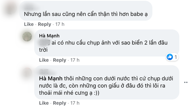 "Sao biển chết là do vớt lên để chụp hình" - Theo tâm lý bình thường mình thấy đại đa số người chụp với sao biển sẽ trả lại về với đại dương. Xác sao biển khô hoàn toàn có thể tìm thấy vì bị mắc cạn trong khoảng thời gian lâu do thuỷ triều, cũng có thể do ý thức của du khách nhưng không phải toàn bộ", travel blogger viết trên trang cá nhân.