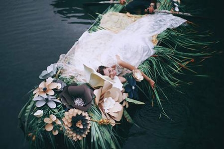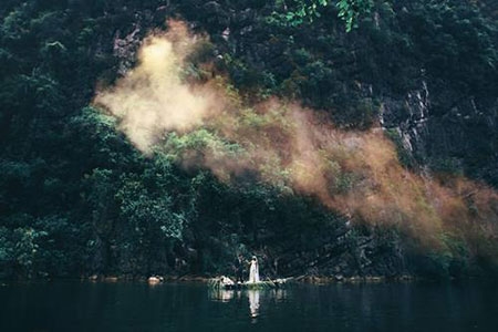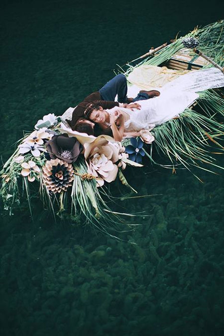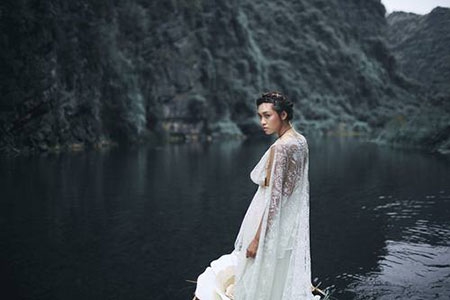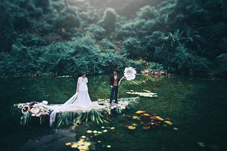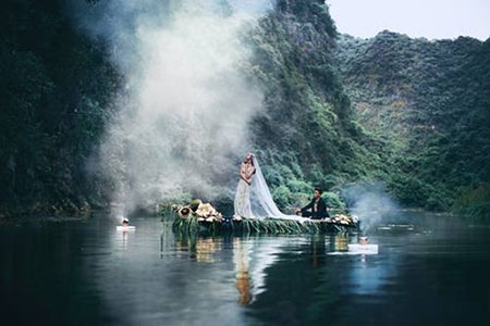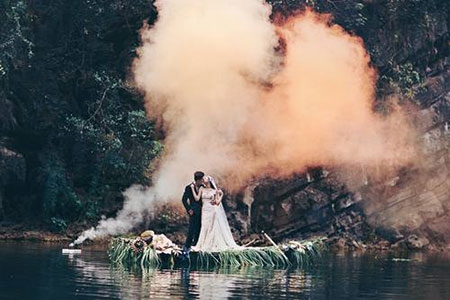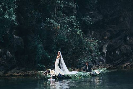 Tâm điểm của bộ ảnh là sự xuất hiện của chiếc thuyền hoa giấy lung linh giữa núi rừng, sông nước. Đó cũng chính là nơi cô dâu và chú rể cùng trao cho những cử chỉ tình tứ, nụ hôn nồng nàn – hình ảnh vừa cá tính mà không làm mất đi vẻ lãng mạn của ảnh cưới. |