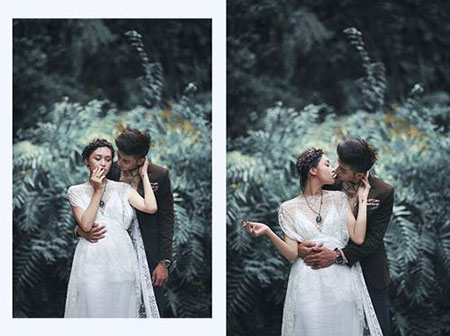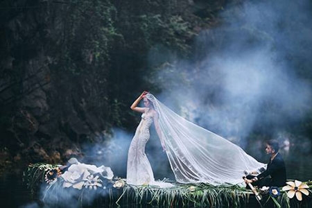 Bộ ảnh cưới của Khả Hân và Xuân Tường khiến người xem say đắm bởi khung cảnh bí ẩn, ma mị và hoang vu của núi rừng. Để có được những khuôn hình độc đáo này, toàn bộ ekip đã phải chuẩn bị kỳ công và tỉ mỉ trong suốt 1 tuần.