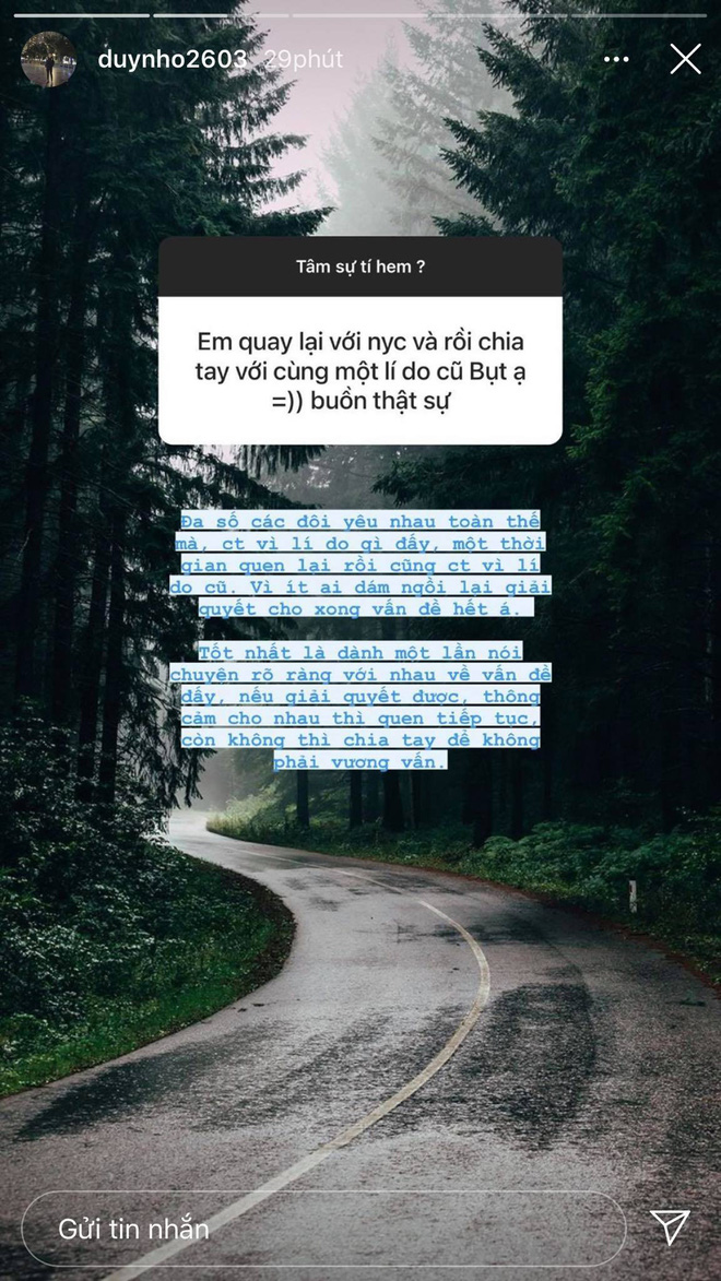 Khi được hỏi chuyện chia tay rồi quay lại nhưng vẫn chia tay vì 1 lý do, bồ cũ Linh Ngọc Đàm cho biết: "Đa số các đôi yêu nhau toàn thế mà. Chia tay vì lý do gì đấy, một thời gian quen lại rồi cũng chia tay vì lý do cũ. Vì ít ai dám ngồi lại giải quyết cho xong vấn đề hết á. Tốt nhất là dành một lần nói chuyện rõ ràng với nhau về vấn đề đấy. Nếu giải quyết được, thông cảm cho nhau thì quen tiếp tục, còn không thì chia tay để không phải vương vấn".