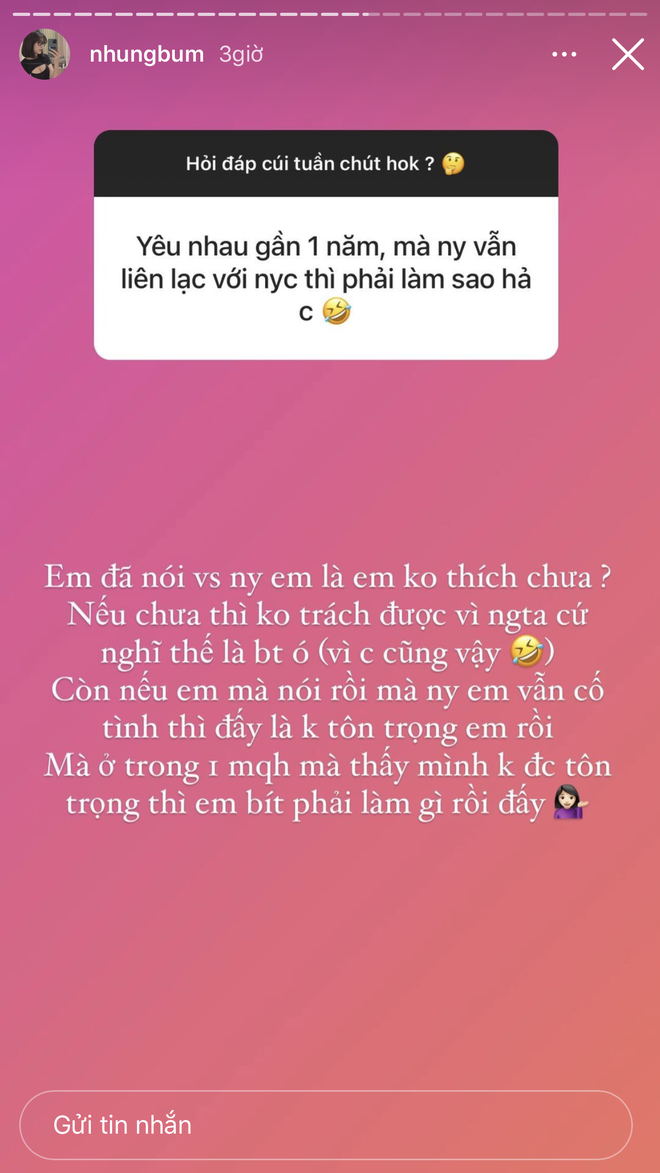 Tuy nhiên cũng trong lần Q&A này, Nhung Bum đã khẳng định mình đang không muốn có tình yêu đẹp mà muốn độc thân vui vẻ. Dẫu vậy cô nàng cũng tiết lộ thêm chuyện vẫn liên lạc với người yêu cũ và nghĩ rằng đó là chuyện bình thường.