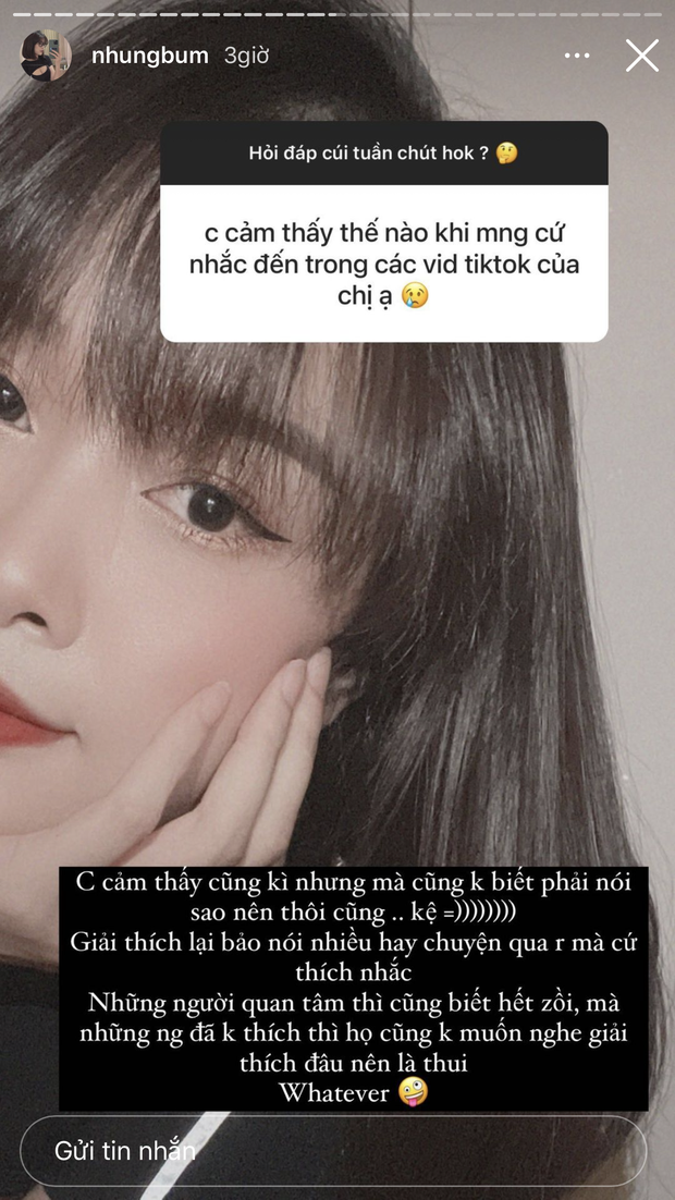 Mới đây, Nhung Bum tiếp tục có những chia sẻ về bồ cũ ở Q&A khiến netizen chú ý. Chẳng cần phải chỉ mặt đặt tên thì ai nấy đều biết người mà cô nàng đang muốn nhắc đến là ai. Trong đó được quan tâm nhất phải là cảm giác của Nhung Bum khi mọi người nhắc đến người ấy ở các video TikTok của cô nàng.