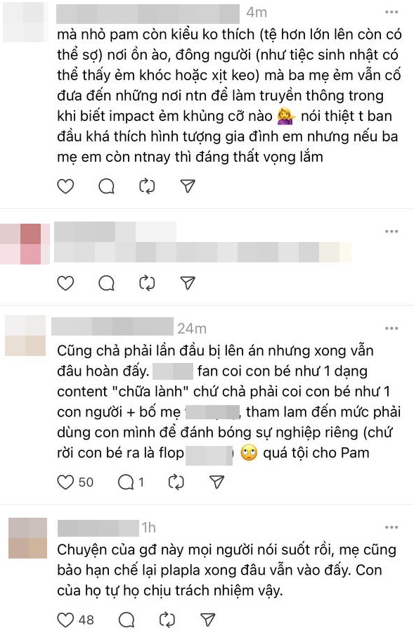 Nhiều người cho rằng, sau khi sự việc group anti nổ ra cách đây vài tháng, gia đình Pam cũng đã bày tỏ sẽ hạn chế đăng hình của em lại. Tuy nhiên, việc cả nhà lựa chọn tham gia sự kiện mở này lại một lần nữa khiến dân tình thất vọng. Bởi netizen bày tỏ, sau cùng, điều bố mẹ Pam quan tâm vẫn là kiếm tiền, nhận booking, quảng cáo trên hình ảnh của con.