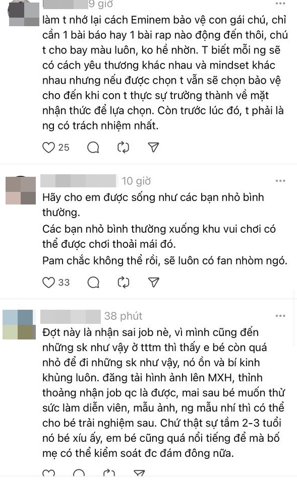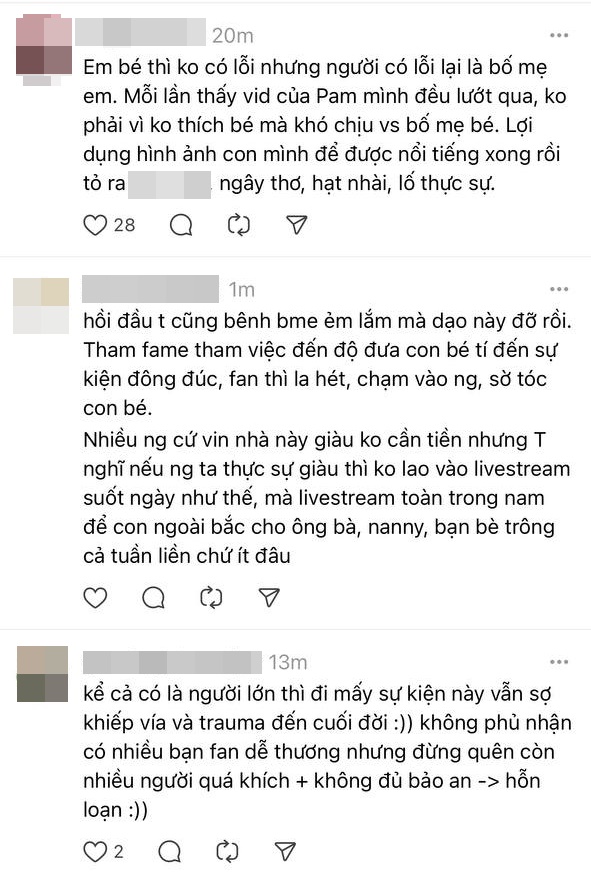 Chưa kể trên MXH Threads cũng đã bắt đầu xuất hiện một làn sóng “quay xe” vì không muốn Pam phải tham dự những sự kiện đông đúc, ồn ào, náo loạn như vậy chỉ để “trả hợp đồng” mà bố mẹ nhận. Ngoài ra, dân tình cũng cho hay dần cảm thấy mất cảm tình, thất vọng cũng như khó hiểu với cách lựa chọn công việc của bố mẹ Pam dành cho em bé hơn 2 tuổi.