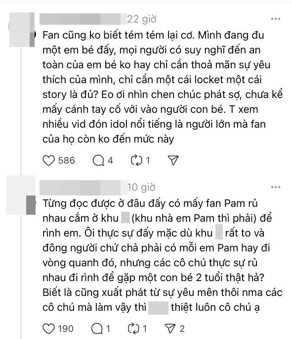 Pam có nhiều người yêu thích, điều này đúng. Nhưng nhìn cách họ “săn đón” một em bé 2 tuổi như một idol lại là điều đáng bàn luận. Trong số đó, họ chỉ đang thực sự quay, chụp Pam để “thoả” niềm yêu thích, “chữa lành” của bản thân chứ không quan tâm đến việc em bé đang cảm thấy như thế nào, có thoải mái khi bị quay chụp hay không.