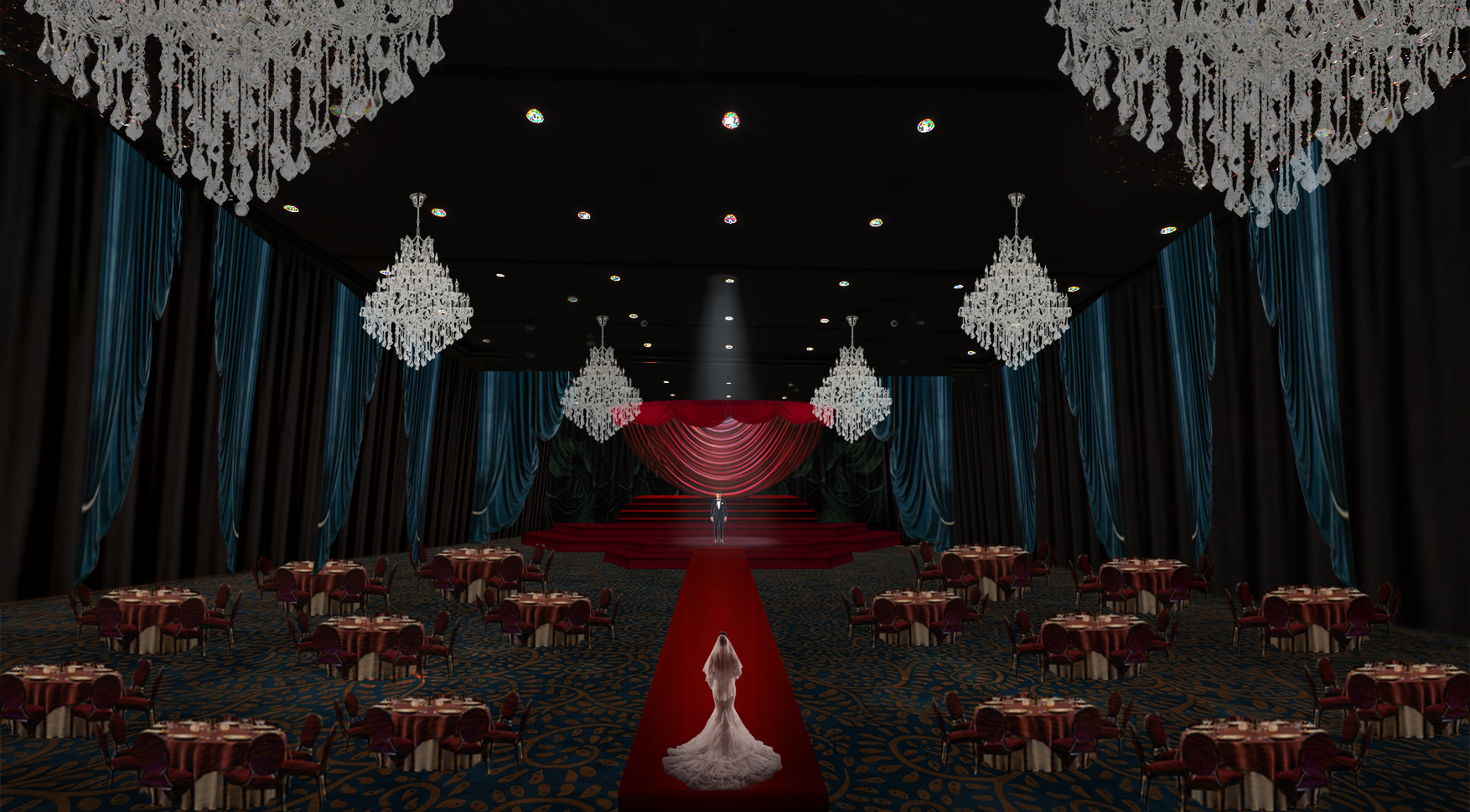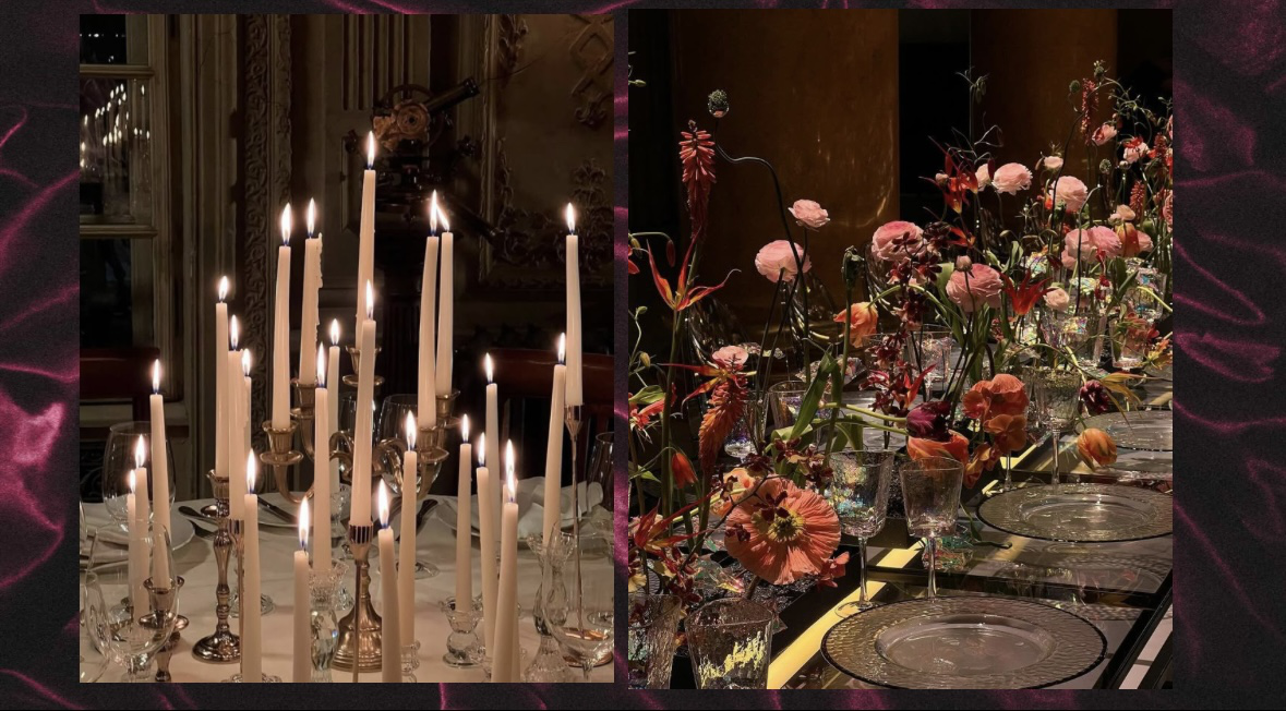 Nữ blogger chọn phong cách cổ điển, thanh lịch và sang trọng. Không gian sân khấu và nơi đón cách được làm giống như một sân khấu Broadway thu nhỏ hoặc dễ dàng liên tưởng đến một buổi triển lãm huyền bí. Ngoài ra, bàn tiệc cũng được đầu tư chỉn chu với nến và hoa tươi theo tone đỏ trầm.