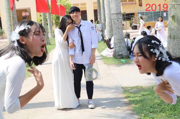 Cách đây 1 năm, cư dân mạng rầm rộ chia sẻ một bức ảnh của nhóm học sinh lớp 12 trong buổi khai giảng cuối cấp. Hình ảnh ghi lại một đôi bạn tay trong tay tình thương mến thương, 2 nữ sinh còn lại thì thể hiện biểu cảm nhắng nhít cùng tâm trạng "ghen tị" với cặp đôi. Nhanh chóng sau đó, khoảnh khắc này thu về hàng trăm nghìn lượt tương tác, được share rộng rãi ở hầu khắp các trang mạng xã hội.