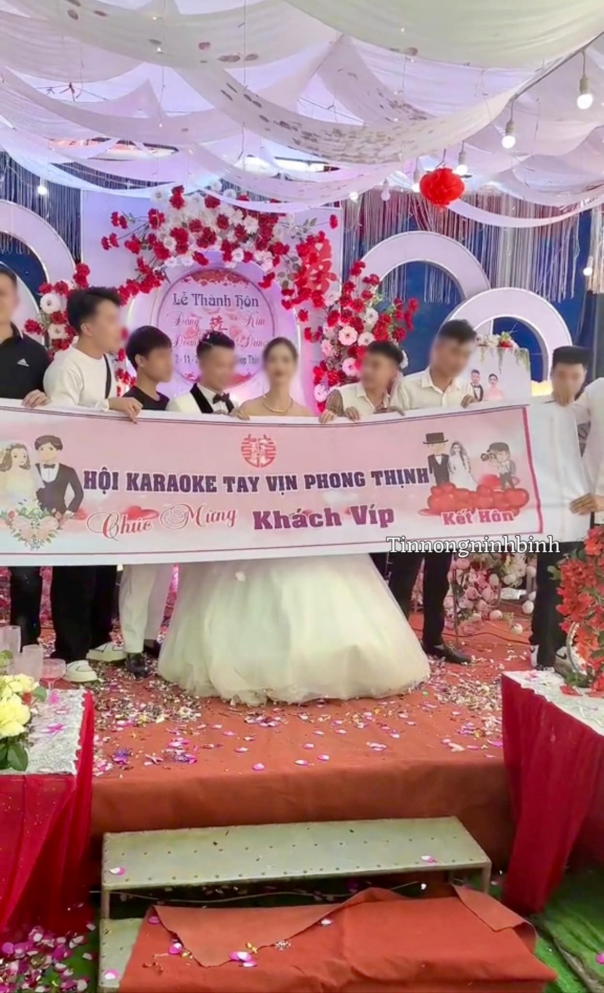 Theo đó, hình ảnh một nhóm 5-6 thanh niên lên chụp hình kỉ niệm với cô dâu chú rể không quên mang theo một tấm băng rôn. Thế nhưng, nội dung ghi trên đó lại khiến nhiều người nóng mắt, "Hội karaoke tay vịn An Thịnh chúc mừng khách VIP kết hôn".