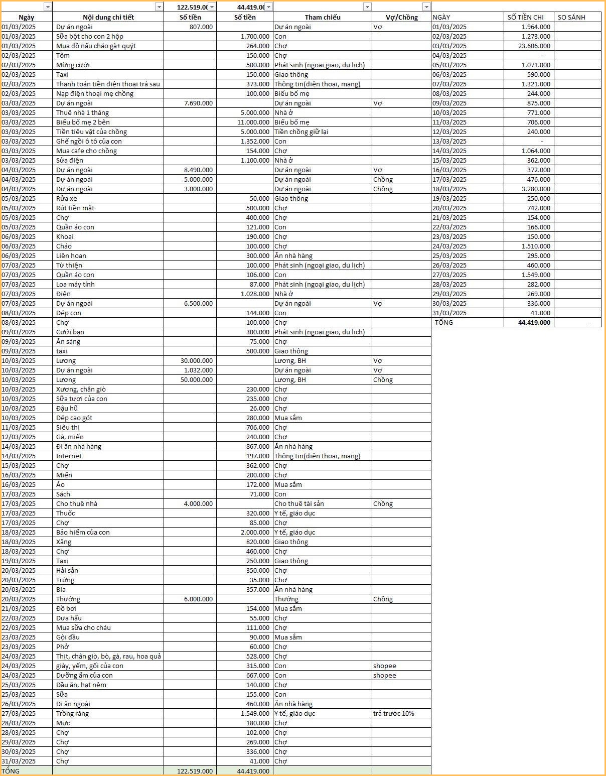Trong bài tâm sự của mình, cô vợ cho biết: “Nhà mình cả 2 vợ chồng đều kiếm tiền và vợ là người giữ tiền. Làm được bao nhiêu chồng mình đều đưa hết cho mình giữ, không bao giờ hỏi tại sao em tiêu nhiều thế. Nhưng bù lại, mình luôn công khai việc quản lý tài chính. Chi tiêu gì mình đều ghi lại và gửi file excel cho chồng cùng xem hàng tuần.