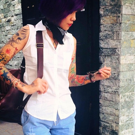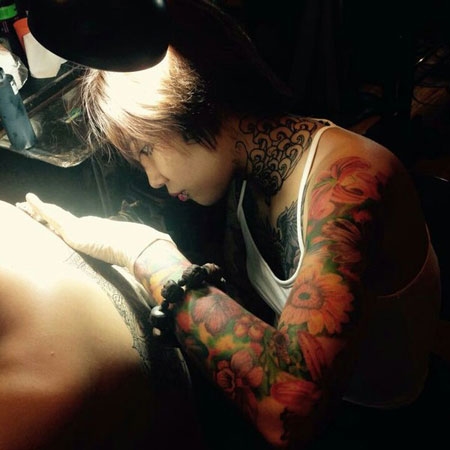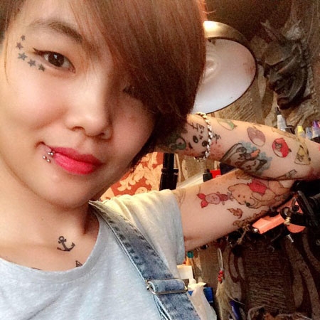 Trên người cô gái này có rất nhiều hình xăm theo nhiều phong cách khác nhau. Theo Mai, cô xăm những hình ảnh nhân vât hoạt hình đáng yêu trên cánh tay chỉ đơn giản vì con trai của cô thích nhìn chúng. |