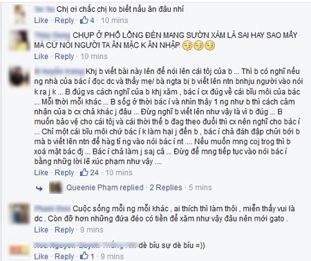 Ngay sau khi được chia sẻ, bức ảnh cùng dòng trạng thái này đã nhận được hơn 20.000 lượt like và 2.000 bình luận. Bên cạnh những ý kiến đồng tình về việc người lớn nên có cái nhìn thoáng hơn về nghệ thuật xăm hình của giới trẻ, thì Mai cũng nhận không ít bình luận góp ý, thậm chí chỉ trích gay gắt thái độ của cô với người phụ nữ trong bức ảnh.