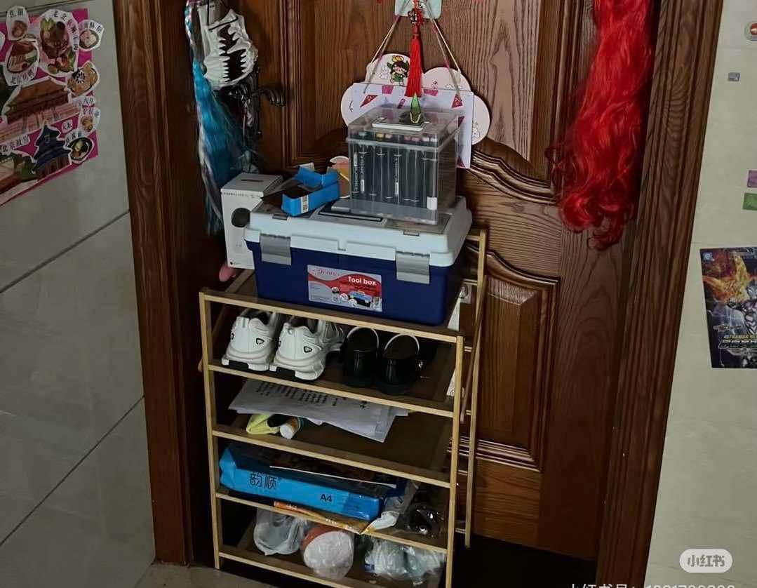 Bởi vì cửa phòng con gái tôi bị hỏng, chìa khoá cũng mất rồi, chỉ có thể khoá trái. Con gái tôi cũng không ở nhà, thế nên tôi bế luôn giá giày ra chặn, thế này có lẽ đám trẻ không vào được đâu nhỉ".