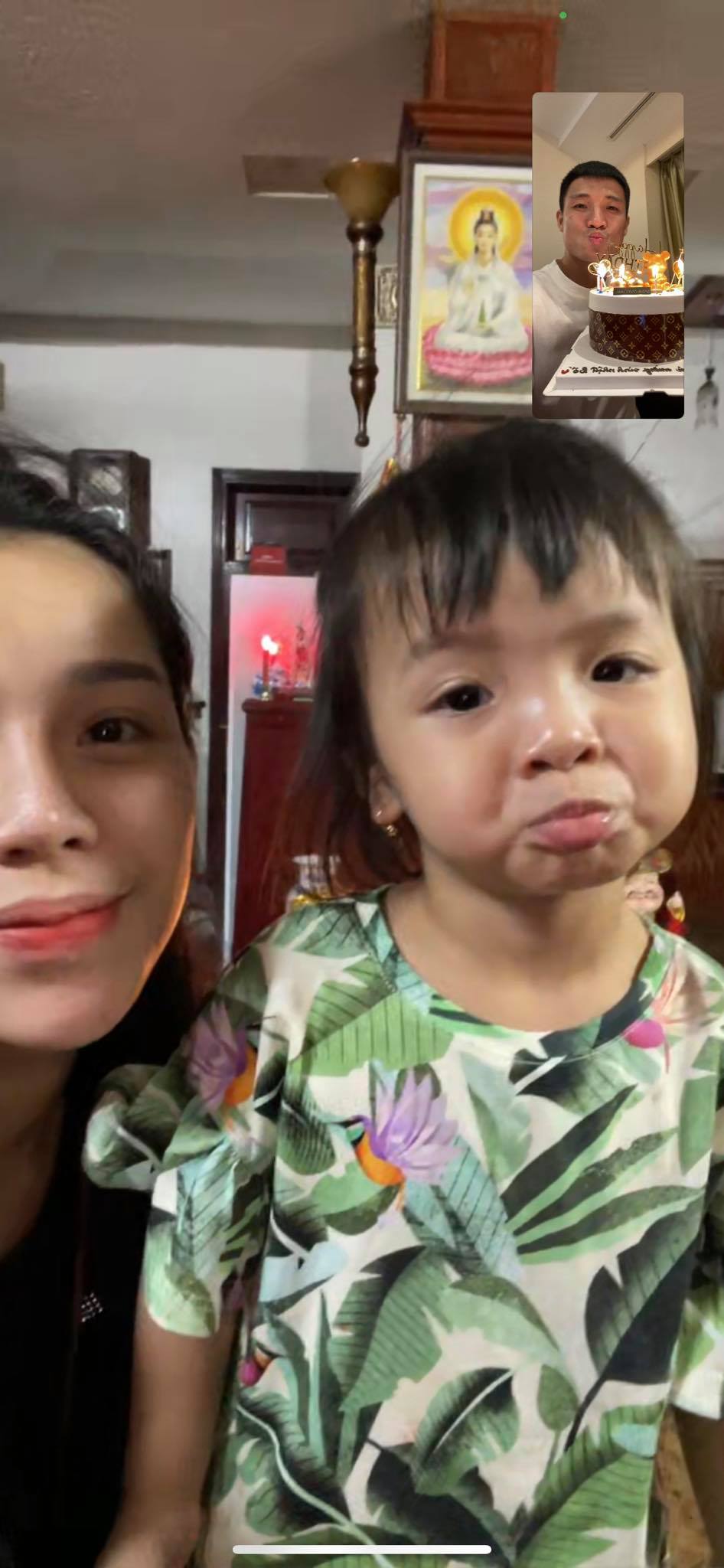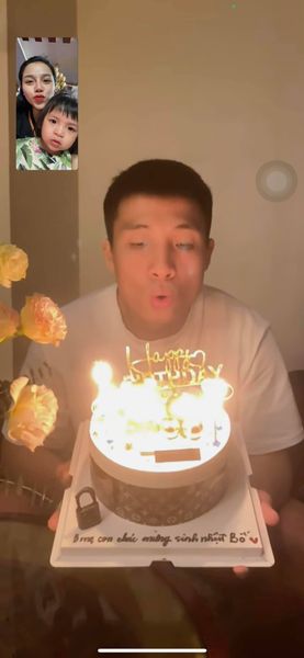 Theo đó, Bùi Tiến Dũng đăng tải trên trang cá nhân hình ảnh món quà từ bà xã Nguyễn Khánh Linh, thổi nến qua màn hình điện thoại cùng vợ và con gái kèm những lời yêu thương.