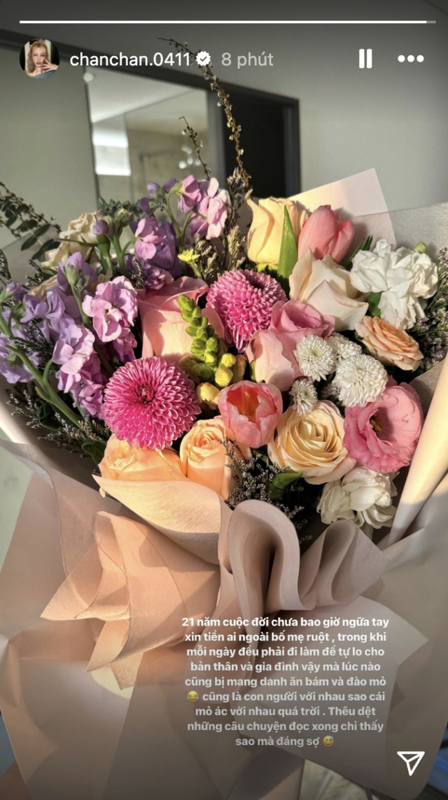 Trước những ý kiến này, Xoài Non thẳng thắn đáp trả. "21 năm cuộc đời chưa bao giờ ngửa tay xin tiền ai ngoài bố mẹ ruột. Trong khi mỗi ngày đều phải đi làm để tự lo cho bản thân và gia đình vậy mà lúc nào cũng bị mang danh ăn bám và đào mỏ. Cũng là con người với nhau sao ác với nhau quá trời. Thêu dệt những câu chuyện đọc xong chỉ thấy sao mà đáng sợ" - cô nói.