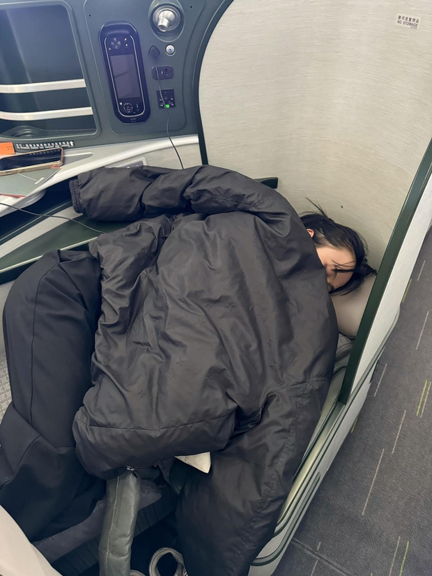 Trái với sự trau chuốt thường thấy, Mina Phạm qua ống kính của chồng lại cực kỳ giản dị. Cô mặc đồ đen toàn tập, lấy áo khoác đắp lên người để nằm ngủ. Vì áo che nửa mặt và có sự thay đổi như vậy nên nếu không nói thì không ai biết là vợ đại gia Minh Nhựa.