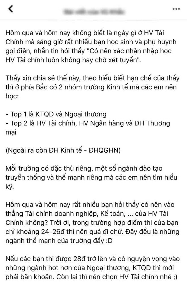 "Hôm qua và hôm nay không biết là ngày gì ở Học viện Tài chính mà sáng giờ rất nhiều các bạn học sinh và phụ huynh gọi điện, nhắn tin hỏi thầy: 'Có nên xác nhận nhập học Học viện Tài chính luôn không hay chờ xét tuyển'.