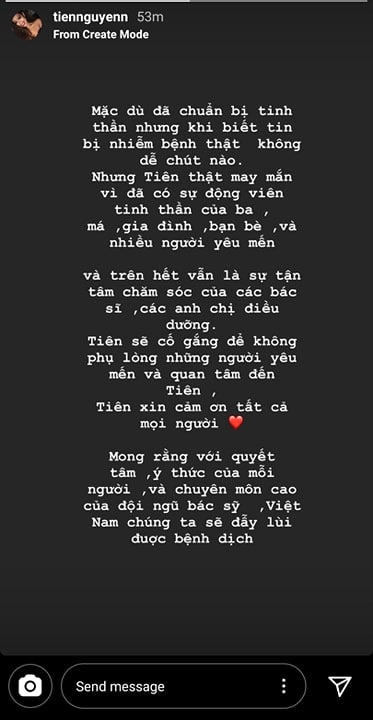Và trên hết là sự tận tâm chăm sóc của các bác sĩ, anh chị điều dưỡng. Tiên sẽ cố gắng để không phụ lòng những người yêu mến và quan tâm đến Tiên. Tiên xin cảm ơn tất cả mọi người. Mong rằng với quyết tâm, ý thức của mỗi người, và chuyên môn cao của đội ngũ bác sĩ, Việt Nam chúng ta sẽ đẩy lùi được bệnh dịch".