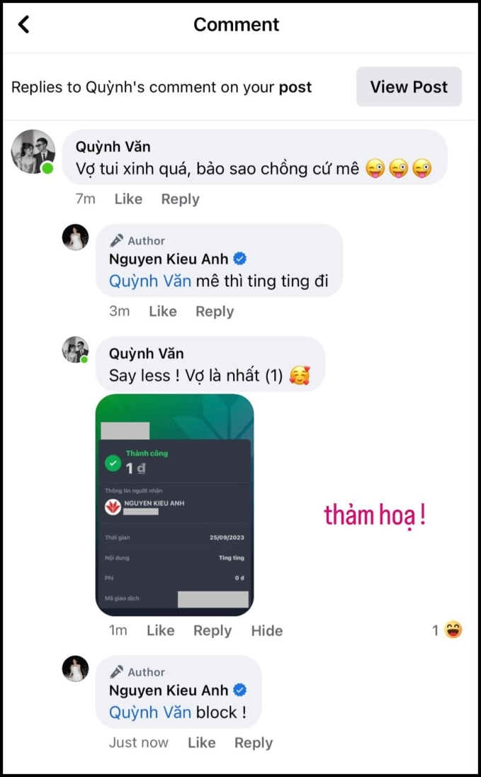 Theo đó cô đăng ảnh mới và được chồng bình luận khen xinh. Được đà, Kiều Anh trả lời: “Mê thì ting ting đi”. Ngay lập tức, Văn Quỳnh liền thực hiện chuyển khoản cho vợ. Đáng nói, khi Kiều Anh chụp lại màn hình số tiền chuyển khoản chỉ có... 1 đồng khiến dân mạng cũng phải bật cười vì độ "lầy lội" của Văn Quỳnh.
