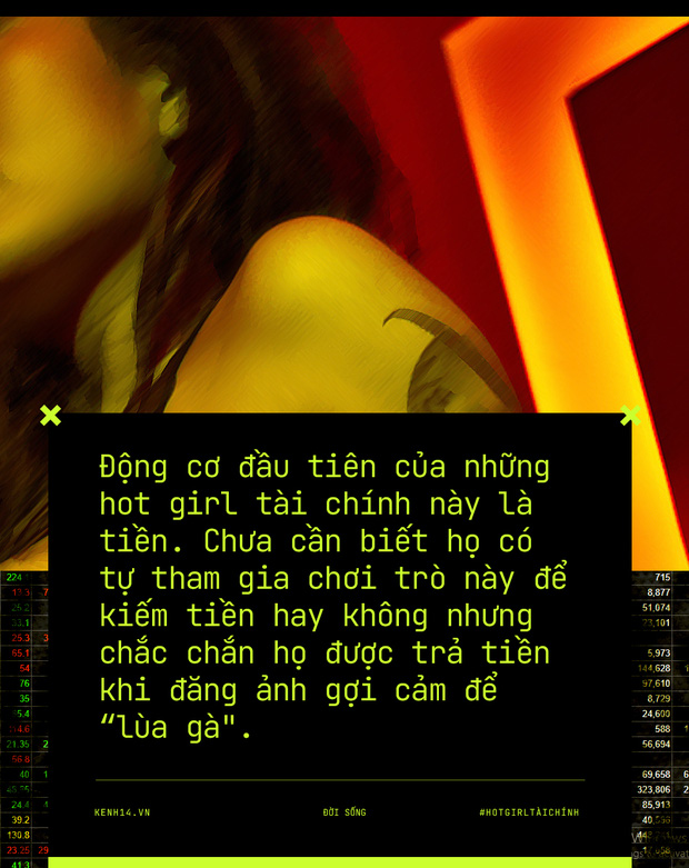 "Động cơ đầu tiên của những hot girl tài chính này là tiền. Chưa cần biết họ có tự tham gia chơi trò này để kiếm tiền hay không nhưng chắc chắn họ được trả tiền khi đăng ảnh gợi cảm để 'lùa gà'. Vì vậy mà những cô nàng này còn phụ thuộc vào những người trả tiền cho họ nữa. Hợp tác với hội 'trùm' này không chỉ đơn giản là chụp vài cái ảnh rồi lấy tiền là xong mà còn ràng buộc, còn điều khoản nhưng có lẽ không biết làm cách nào, không biết nhờ ai giúp để dứt ra.