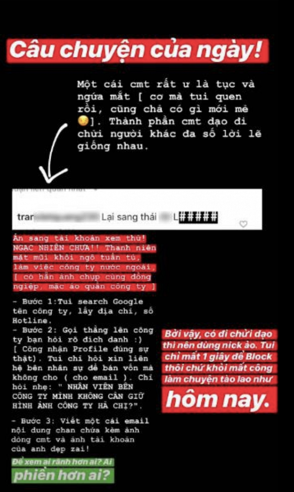 Mới đây, bạn gái Lâm Tây đã phải buông lời chửi xéo một anti-fan trên story instagram: "Bạn Linh Linh gì mới comment chửi 800 câu, vui lòng tạo nick ảo mới, commnet chửi lại cho Xuân chặn tiếp nha. Sẵn tiện nhắn dùm địa chỉ nhà Xuân gửi tặng chai dầu gió bóp tay cho đỡ mỏi với bịch muối. Nể thật sự luôn, bao nhiêu từ tục tĩu, bẩn thỉu nhất nó có sẵn trong đầu để bạn xài, chắc là cả quá trình tích luỹ trau dồi hoặc do bẩm sinh thiên phú. Xuất sắc quá, vỗ tay", Yến Xuân mỉa mai.