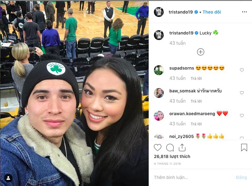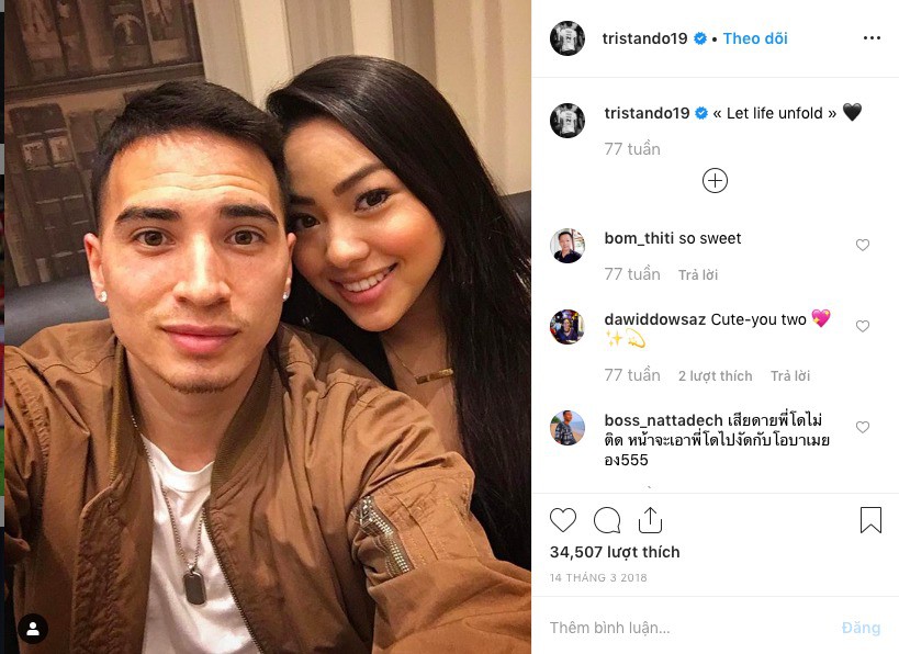 Cách đây vài tuần, Tristan và Belle đã kỷ niệm 4 năm bên nhau. Trải qua scandal tình cảm, có đôi lúc cầu thủ này thay lòng đổi dạ nhưng vượt qua tất cả, họ vẫn gắn bó với nhau. Điều này khiến dân mạng Thái Lan vô cùng ngưỡng mộ và gửi rất nhiều lời khen ngợi dưới các bài đăng.
