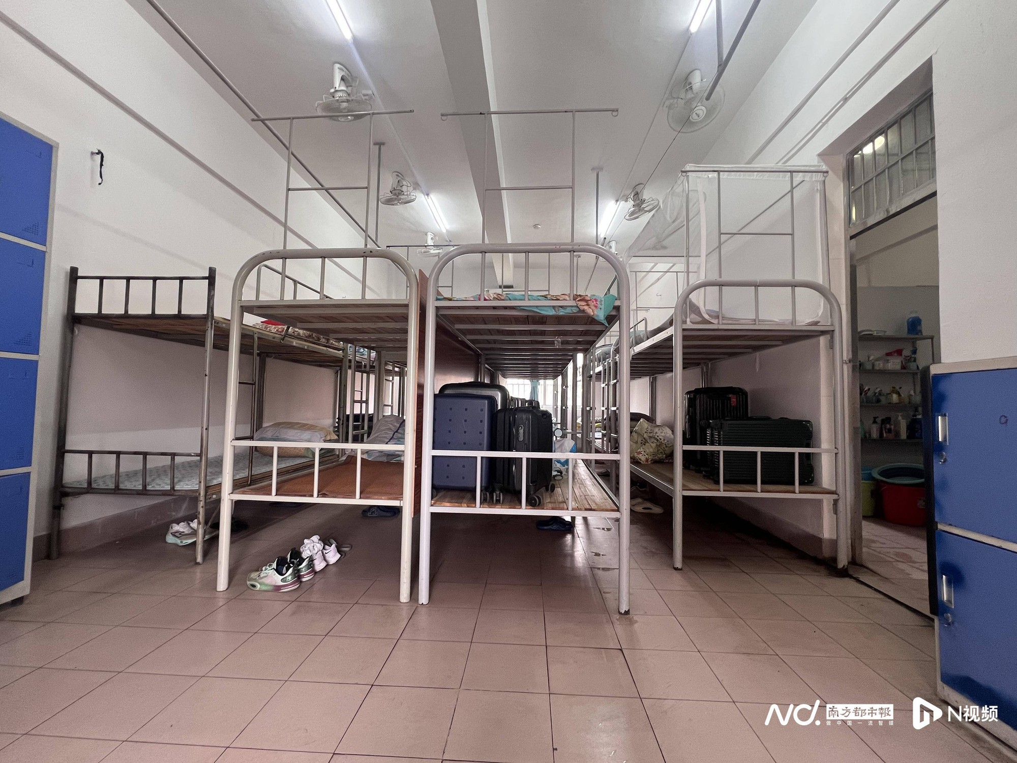 Ngoài khu vực giường ngủ, trong phòng còn có một số tủ đựng đồ màu xanh do trường cung cấp, còn vali của học sinh được đặt trên một số giường trống.