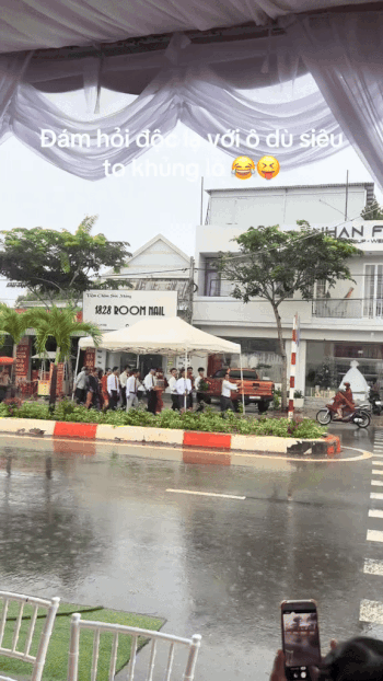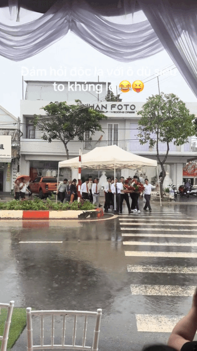 “Không phải gần mà nhà trai đứng bên kia đường, chờ đúng giờ mới vô nhà gái. Hên sao kế bên có cái rạp di động nên cái khó ló cái khôn, nhà trai mượn khiêng luôn” - chủ nhân clip giải thích.
