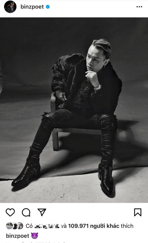 Trong một bức ảnh khác thì Châu Bùi dùng emoji mặt quỷ màu tím kèm emoji máy chụp ảnh. Cho ai chưa biết thì Binz cũng từng đăng một tấm ảnh đen trắng của bản thân và dùng emoji tương tự.