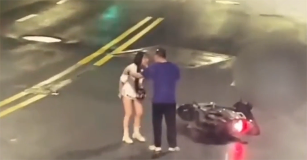 Sau một hồi xảy ra cãi vã, người phụ nữ đã đạp đổ chiếc xe máy xuống đường trong cơn nóng giận. Thấy vậy, người đàn ông liền đưa tay lên, cố gắng vuốt ve khuôn mặt của bạn gái để xoa dịu cảm xúc của cô.