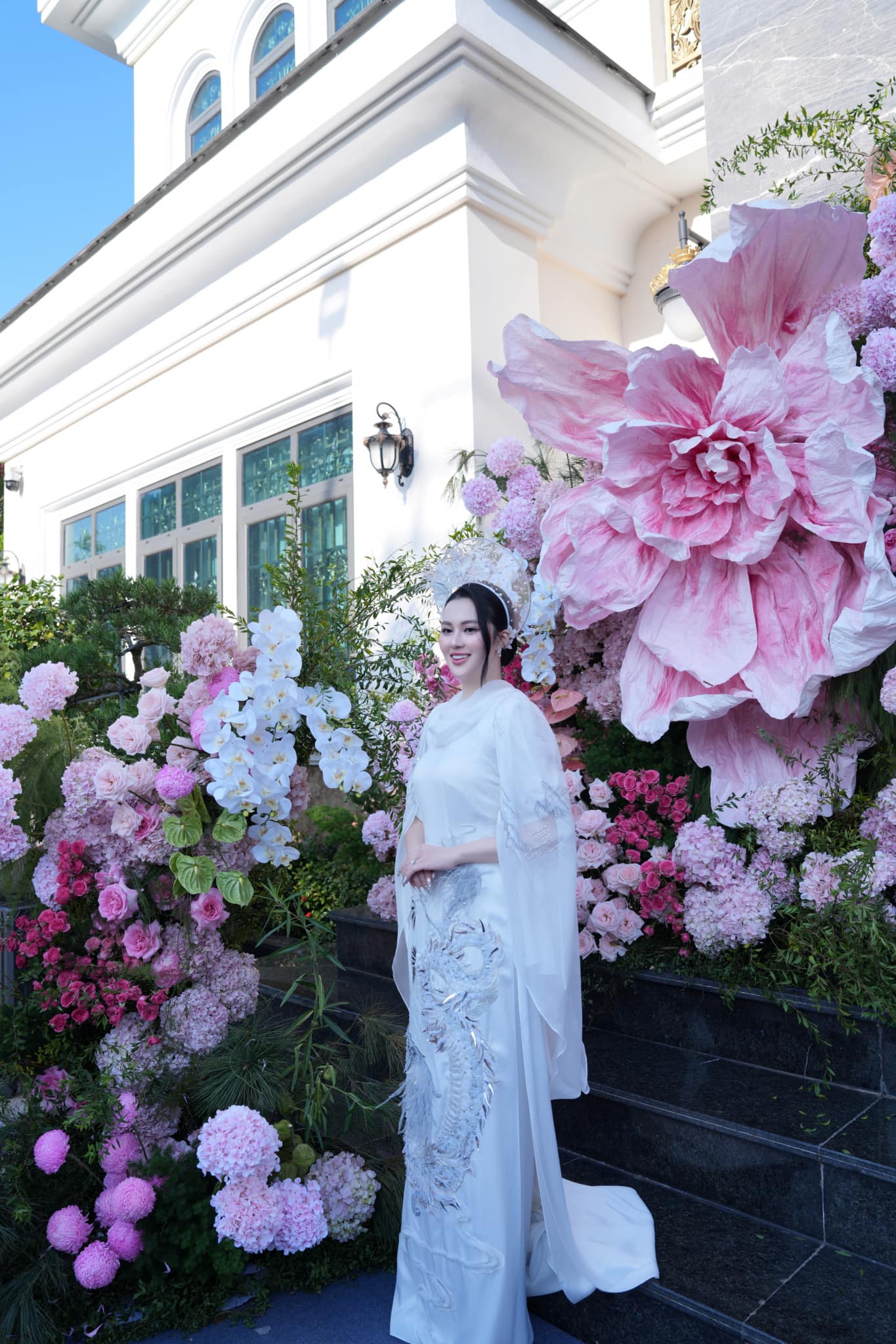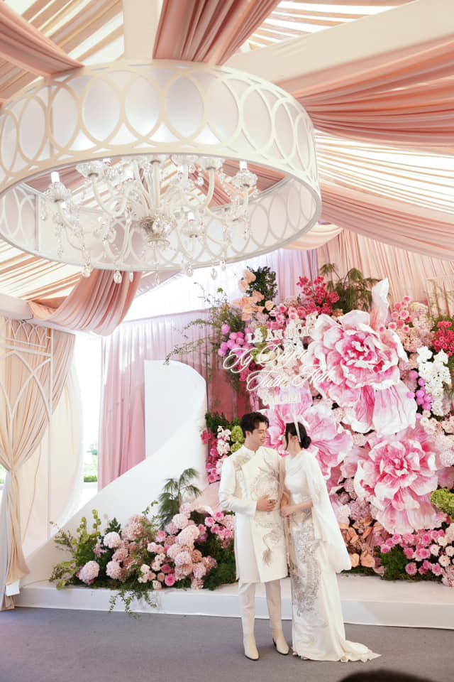 Không tiết lộ quá nhiều về gia thế, nhưng chỉ một góc cổng hoa trang trí cũng hé lộ đôi chút về cơ ngơi của gia đình cô dâu. Một biệt thự màu trắng với cửa gỗ nguy nga tráng lệ thể hiện sự giàu có và tinh tế của gia chủ.
