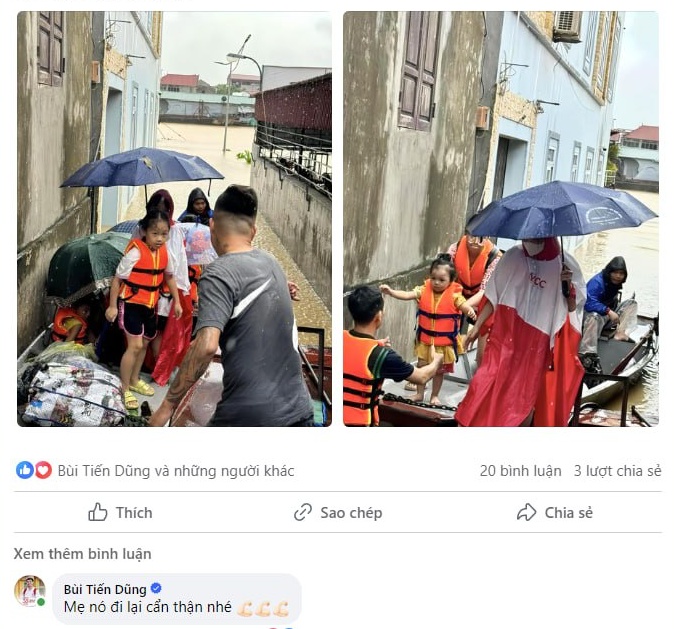 Trước đó, dù đang trong thời gian thai nghén nhưng Khánh Linh vẫn lặn lội đi hỗ trợ đồng bào bị ảnh hưởng do lũ lụt. Vì bận thi đấu nên Bùi Tiến Dũng không tham gia cùng, chỉ để lại bình luận dặn dò: “Mẹ nó đi lại cẩn thận nhé”.