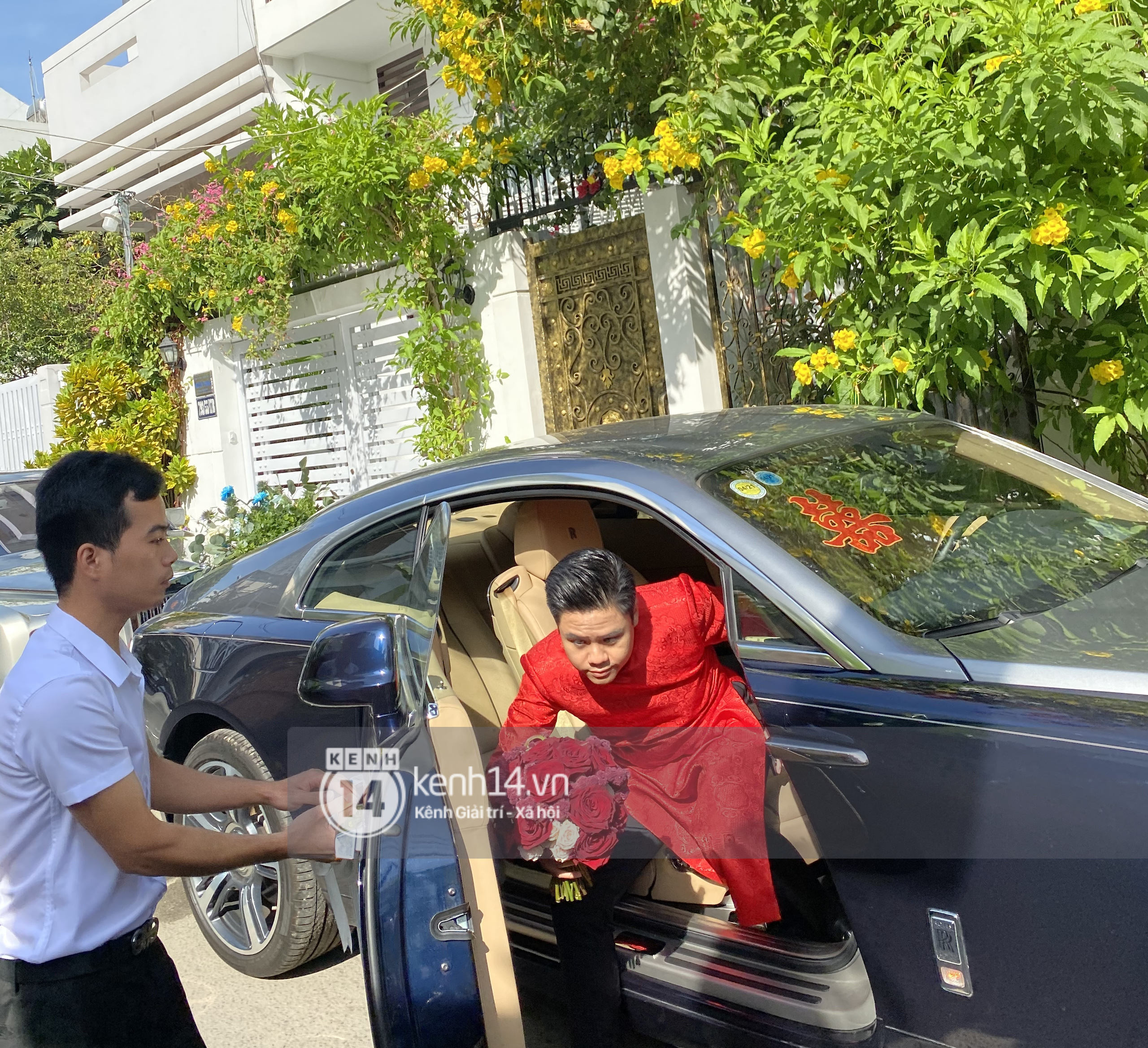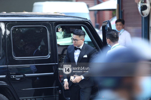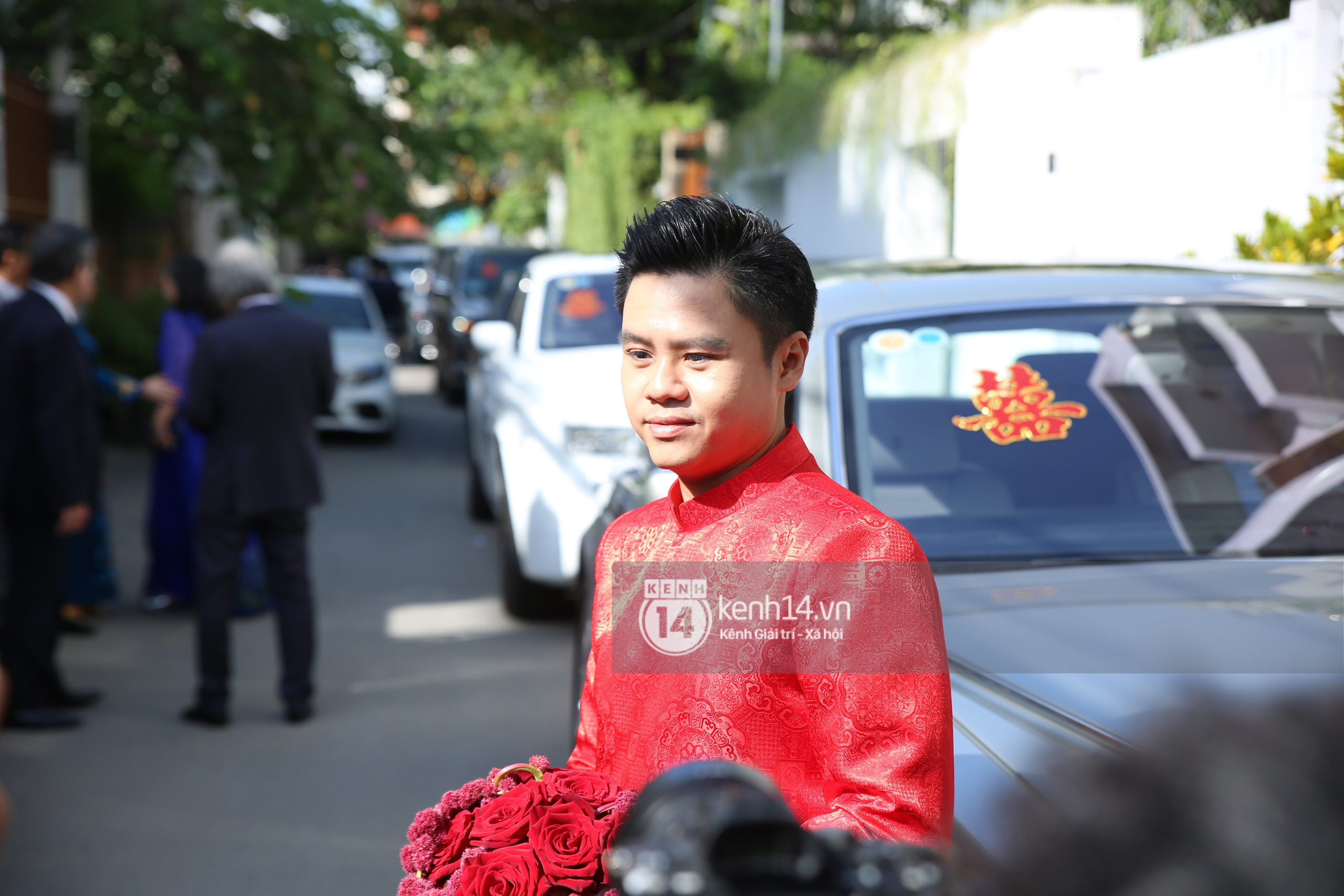 Dàn phù rể phía thiếu gia Phan Thành bắt đầu lục tục xuất hiện cùng dàn xe sang. Chú rể cũng lộ diện. Trang phục chàng thiếu gia chọn cho ngày trọng đại của mình là áo dài đỏ.
