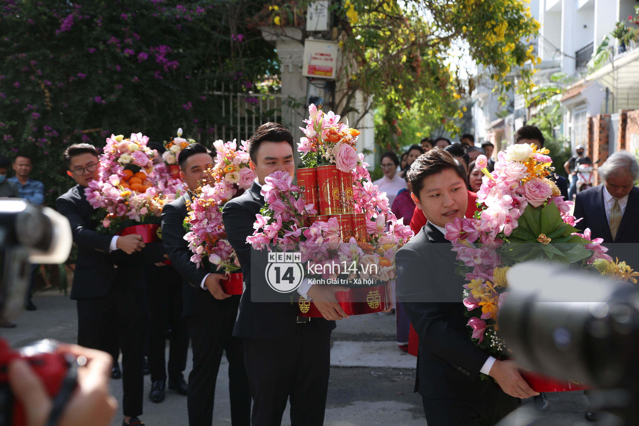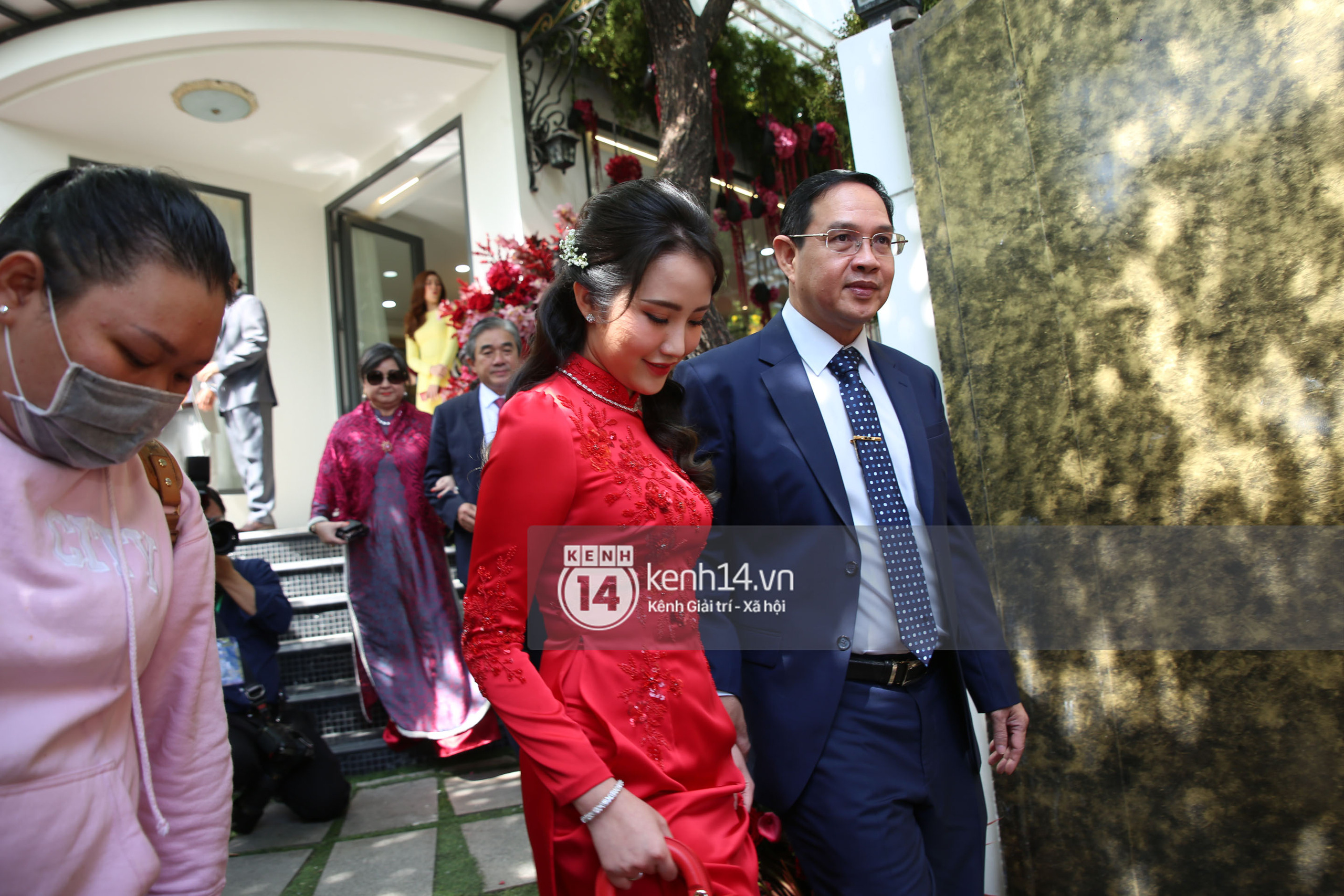 Nghi lễ rước dâu chính thức được tiến hành. Cô dâu Primmy Trương xinh đẹp tuyệt trần trong bộ áo dài đỏ rực và nhanh chóng chiếm hết spotlight.