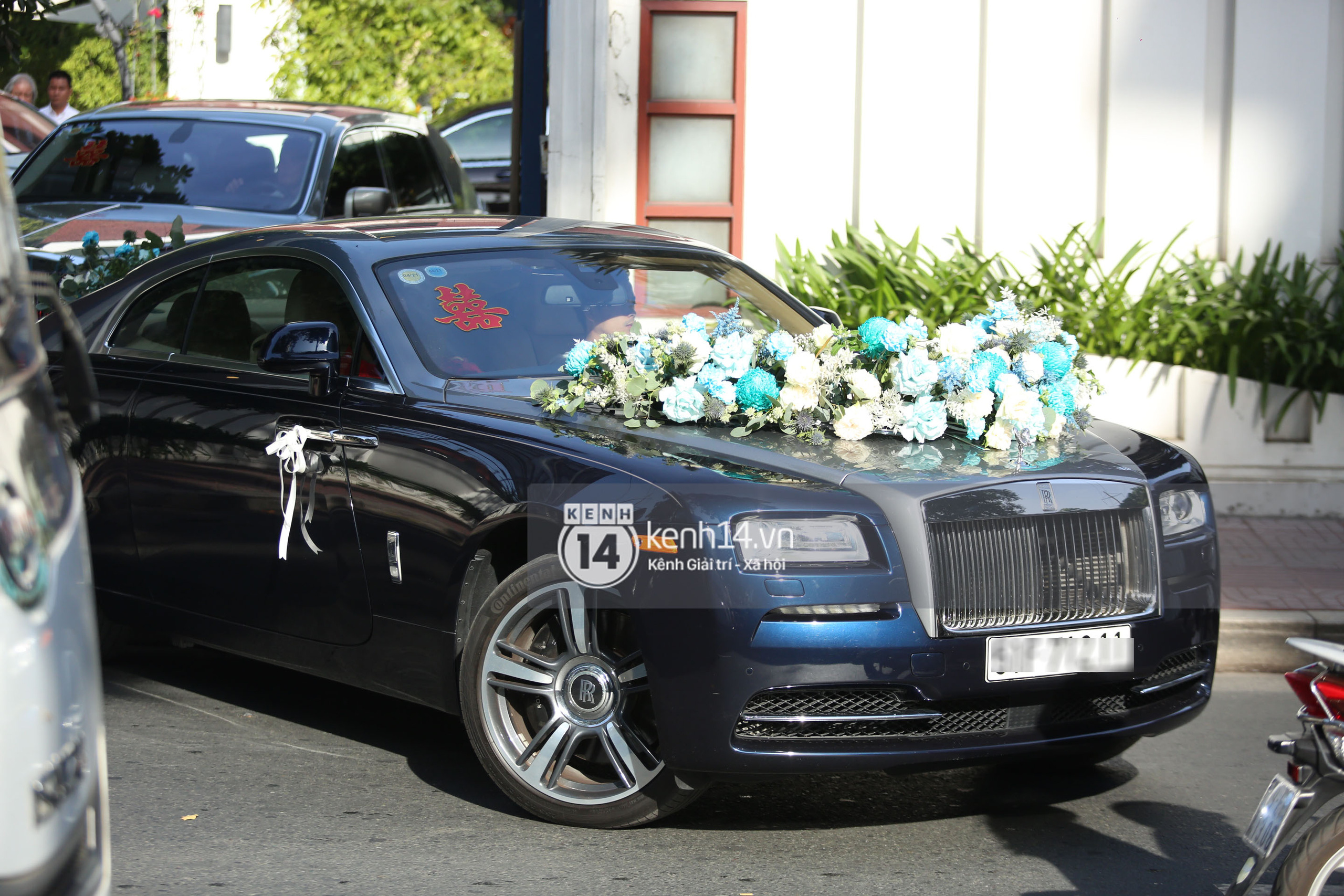 Phái đoàn nhà trai bắt đầu di chuyển đến nhà cô dâu. Dẫn đầu là siêu xe 34 tỷ của Phan Thành. Chiếc xe sang trọng được trang trí với hoa màu xanh - màu sắc yêu thích của Primmy Trương.