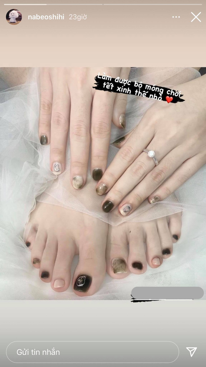 Trân Nguyễn - chị gái Bảo Hân Helia kịp làm luôn cả chân lẫn tay cho đồng bộ. Cũng chính vì vậy mà cô nàng ghi caption vô cùng vui vẻ: "Làm được bộ móng chơi Tết xinh thế nhờ".