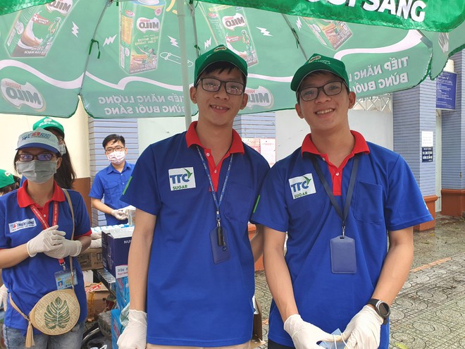 Đó là cặp song sinh Nguyễn Hoàng Huynh, là anh và Nguyễn Hoàng Đệ, là em. Hai anh em năm nay 20 tuổi, cùng là sinh viên năm 2 ngành công nghệ thông tin Trường ĐH Ngoại ngữ Tin học TP.HCM. Họ đang cùng với 14 bạn trẻ khác cũng là sinh viên tiếp sức mùa thi, hỗ trợ thí sinh thi tốt nghiệp THPT.