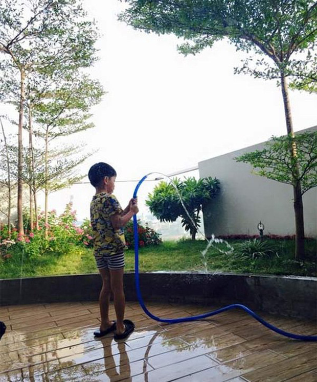 Đây là cách "nữ hoàng giải trí" giúp con trai hiểu được ý nghĩa lao động. Không chỉ ở Việt Nam mà ngay cả khi đi du lịch Mỹ, cậu nhóc vẫn phải làm việc nhà như thường.