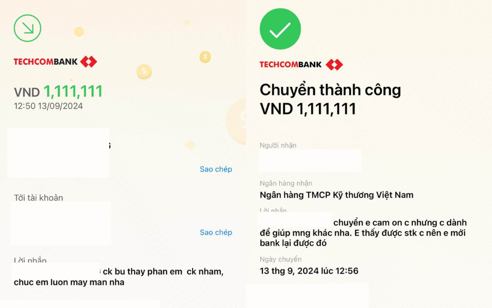 Cụ thể là câu chuyện của một chàng trai tên T.K.T., khi chuyển khoản ủng hộ đồng bào bão lũ vào tài khoản của Mặt trận Tổ quốc, chàng trai đã nhỡ tay chuyển đến 2 lần. Số tiền mỗi lần chuyển là 1.111.111 đồng.