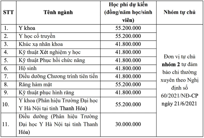 Năm học 2024-2025, dự kiến mức thu học phí của Trường đại học Y Hà Nội vào các ngành từ 15 đến 55,2 triệu đồng/năm học. Những ngành có mức học phí cao nhất 55,2 triệu đồng/năm học là: Y khoa, Y khoa phân hiệu Thanh Hóa, Y học cổ truyền, Răng hàm mặt.