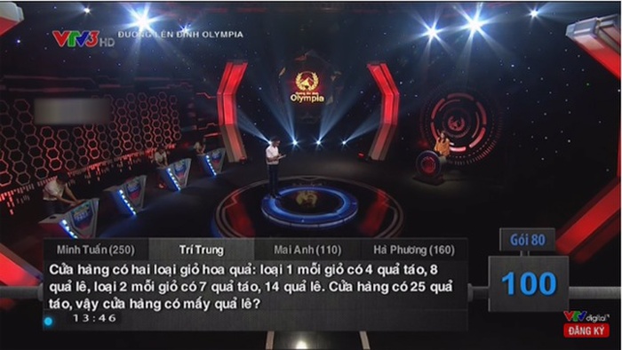 Cụ thể, câu hỏi này xuất hiện ở phần thi Về đích của thí sinh Lê Trí Trung (THPT Vĩnh Bình, An Giang) với nội dung như sau: "Cửa hàng có hai loại giỏ hoa quả: loại 1 mỗi giỏ có 4 quả táo, 8 quả lê; loại 2 mỗi giỏ có 7 quả táo, 14 quả lê. Cửa hàng có 25 quả táo, vậy cửa hàng có mấy quả lê?".