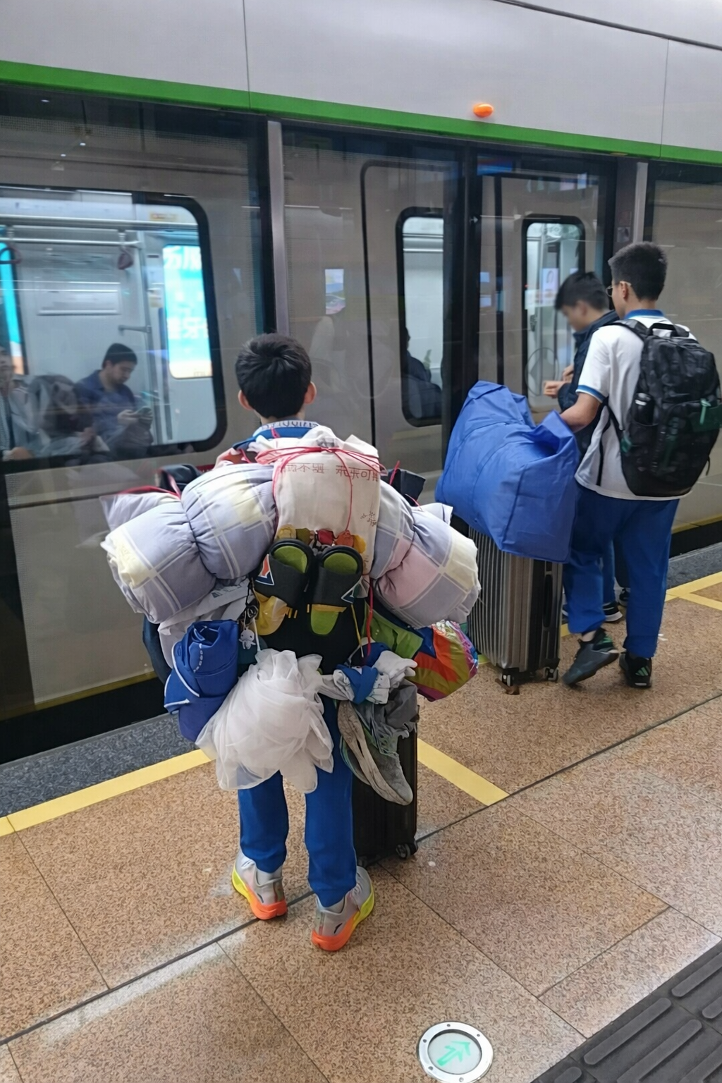 Trong bức hình đang được chia sẻ rộng rãi, cậu bé mặc đồng phục học sinh, dáng người nhỏ nhắn nhưng tự tin, một tay đẩy vali, trên lưng và hai bên người là nhiều túi đồ được buộc chắc chắn, gọn gàng bằng dây đeo. Cậu đứng chờ tàu điện ngầm, một mình xoay xở với khối hành lý cồng kềnh khiến không ít người lớn cũng phải trầm trồ. Nhiều bình luận cho rằng khả năng sắp xếp và “đóng gói” của cậu bé thậm chí vượt quá tưởng tượng đối với một học sinh cấp hai.