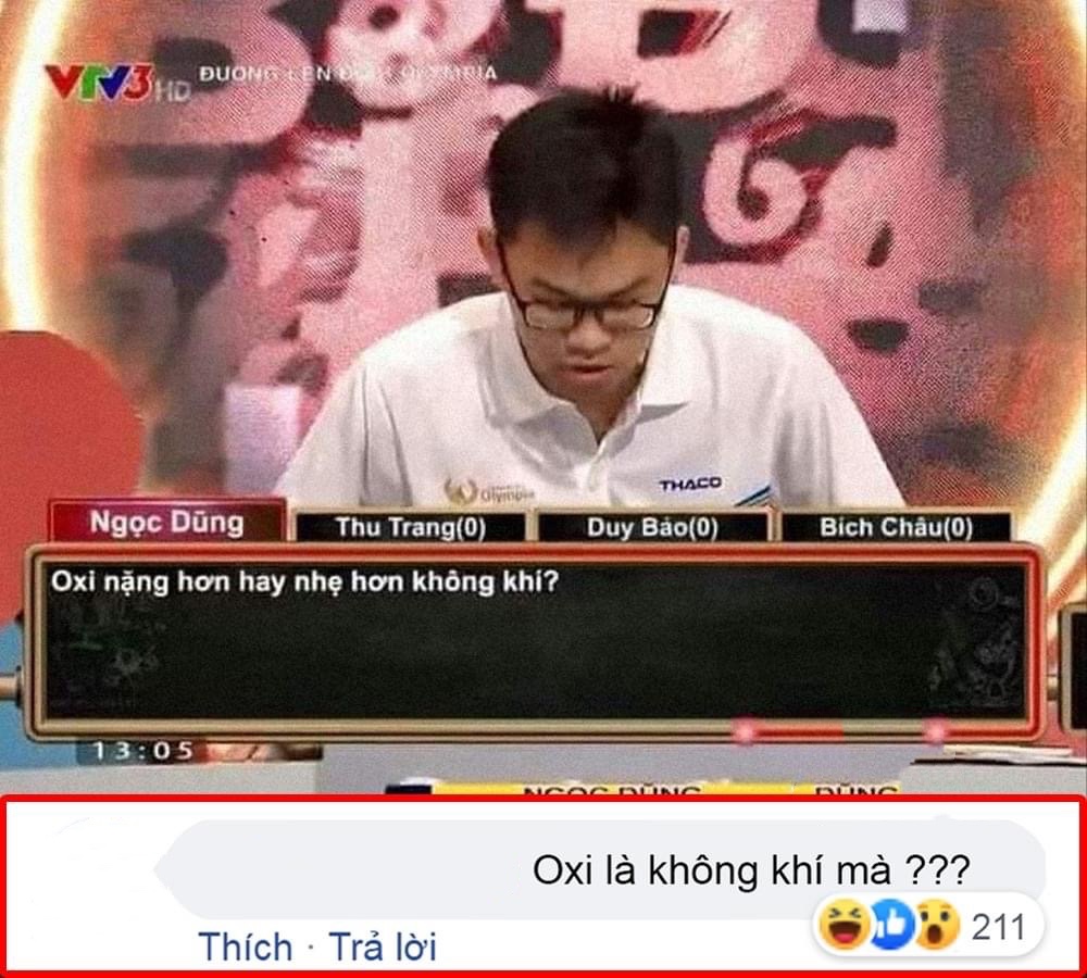 Trước đó trong vòng thi Khởi động của Nguyễn Ngọc Dũng có câu hỏi như sau: "Oxy nặng hơn hay nhẹ hơn không khí". Nam thí sinh lập tức đưa ra câu trả lời "nặng hơn" và giành được điểm.