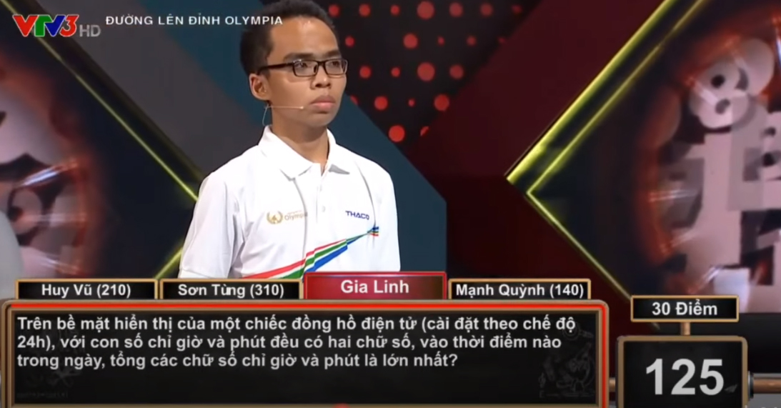Nhiều người nhận định, câu hỏi 30 điểm thực tế không quá khó, nhưng áp lực thời gian đè nặng có thể khiến thí sinh không kịp đưa ra đáp án chính xác. Tuy nhiên, thí sinh nhận câu hỏi này - nam sinh Gia Linh (THPT Chuyên Hùng Vương - Bình Dương) đã đưa ra đáp án chính xác kịp thời: 19 giờ 59 phút.