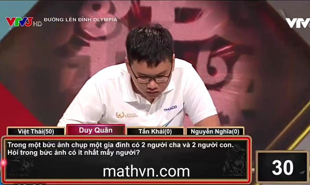 Dữ kiện "ít nhất" trong nội dung câu hỏi đã thách đố các thí sinh nếu không để ý. Theo đó, gia đình có 2 người cha và 2 người con. Để có số thành viên ít nhất, gia đình ấy sẽ có 1 người ông - 1 người bố và 1 người cháu. Như vậy sẽ đảm bảo dữ kiện 2 người cha (ông và bố) và 2 người con (bố và cháu). Đáp án đúng là 3 người!