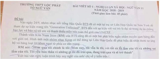 "Thành viên Kim Nam Joon (RM) của BTS đã có một bài phát biểu ngắn truyền cảm hứng đến với giới trẻ. Hình ảnh một nhóm nhạc Kpop có thể đứng tại Liên hợp quốc để phát biểu đã nhận được sự ủng hộ và hàng loạt lời khen ngợi từ cư dân mạng. RM nói: 'Hôm qua tôi chính là tôi. Hôm nay, tôi vẫn là tôi, với tất cả lỗi lầm của tôi và những sai lầm của tôi. Tôi yêu bản thân vì những gì đã trải qua, đang trải qua và sẽ trở thành'. Viết bài văn nghị luận trình bày suy nghĩ của anh/chị về ý kiến trên"'.