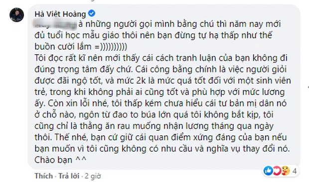 Không biết sau những comment trên, anh chàng H.H đã hiểu ra mọi chuyện chưa. Nhưng trước sự ủng hộ nhiệt tình của Hà Việt Hoàng, số bình luận đã lên đến hàng trăm và thu hút sự chú ý của cộng đồng mạng.