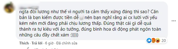 Dân mạng tên H.H cho biết: "Người ta đòi lương như thế vì người ta thấy xứng đáng thì sao? Căn bản là bạn kiếm được tiền dễ nên bạn nghĩ rằng ai cũng lười với yếu kém nên mới đáng chịu lương thấp. Đúng thật cái gì dễ quá thành ra tự kiêu, ảo tưởng. Đúng bình hoa di động phát ngôn toàn những câu đầy chất xám".