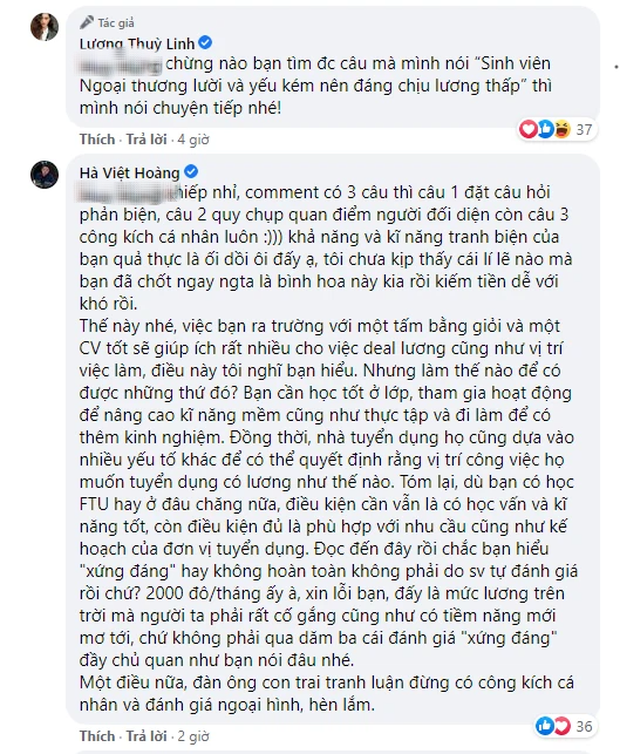 Trước bình luận gay gắt này, Hoa hậu Lương Thùy Linh đã lập tức đáp trả: "Chừng nào bạn tìm được câu mình nói: 'Sinh viên Ngoại thương lười và yếu kém nên đáng chịu lương thấp' thì mình nói chuyện tiếp nhé!".