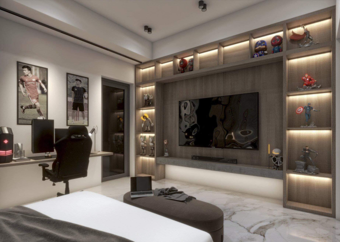 Đặc biệt không gian bên trong vô cùng hiện đại. Ấn tượng đầu tiên mà căn phòng mang đến là một cảm giác thư giãn, tĩnh lặng. Sử dụng chủ yếu các chất liệu gỗ ép với gam màu trung tính, nơi nghỉ ngơi của Hoàng Đức vừa mang đến sự ấm cúng nhất định mà không quá hào nhoáng.